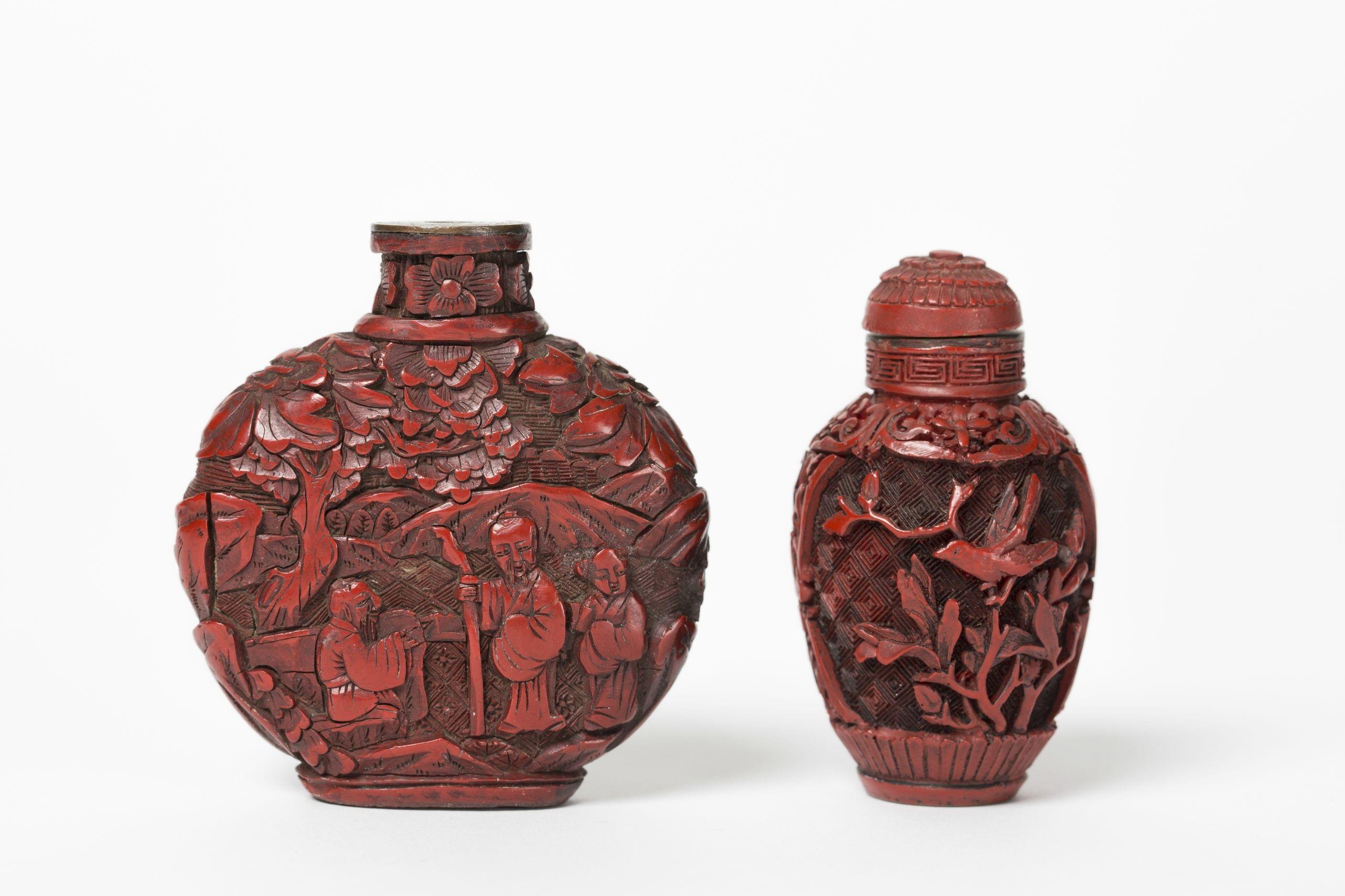 Laque rouge de cinabre à décor de paysages animés et oiseaux, H 6 et 6,5 cm