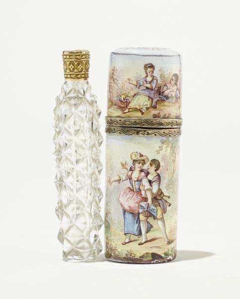 Verre à décor de paysage lacustre et élégantes, H 8 cm