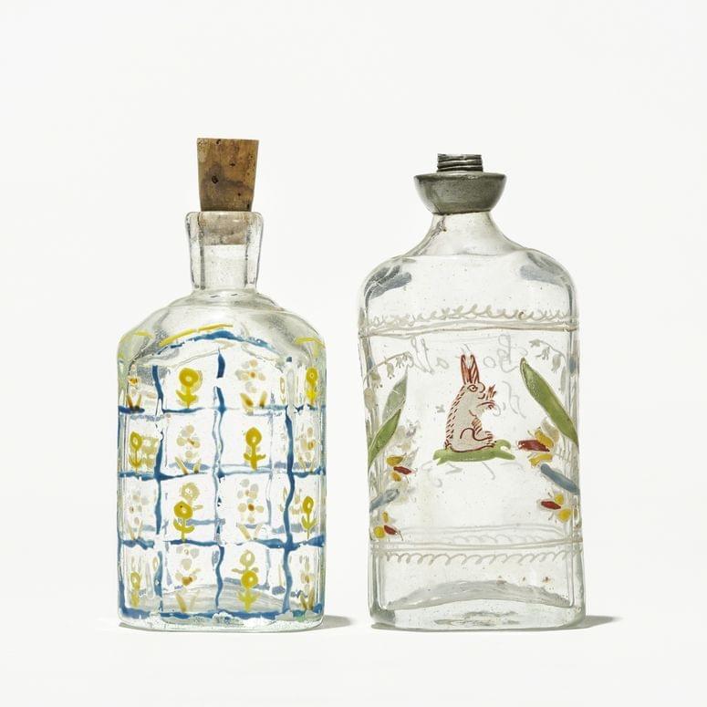 Verre souflé à décor émaillé polychrome, l'un daté 1723, H 11 et 12 cm. Provenance: Château fribourgeois