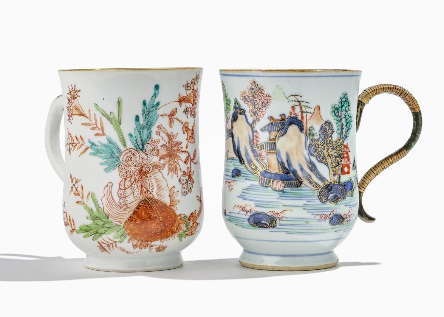 Porcelaine émaillée polychrome à décor d'un paysage et motifs floraux, H 14 cm (une anse en métal)