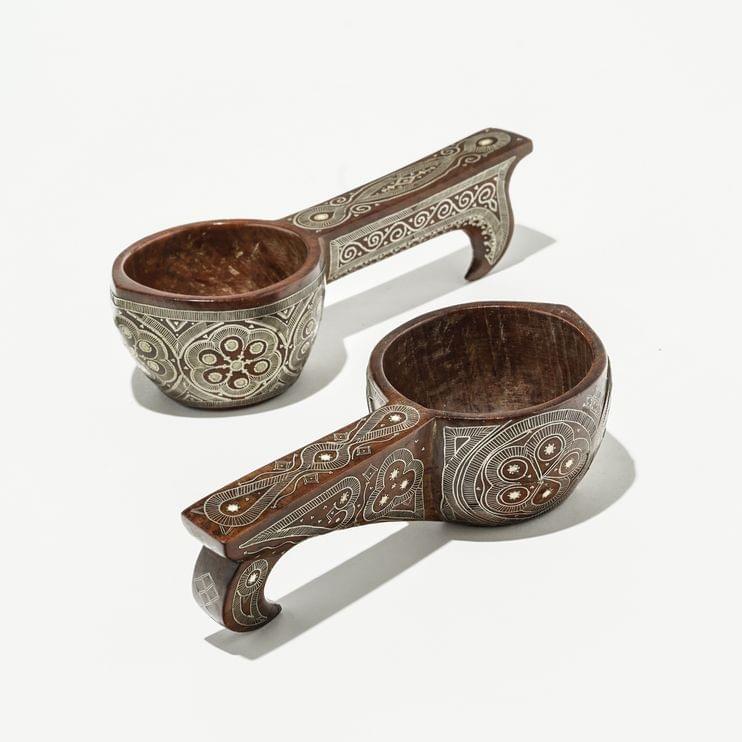 153. Deux kovshs à décor incrustés de rosaces et rinceaux