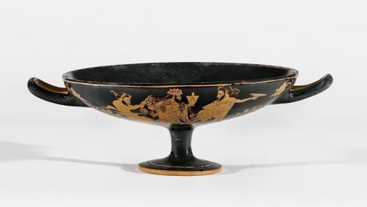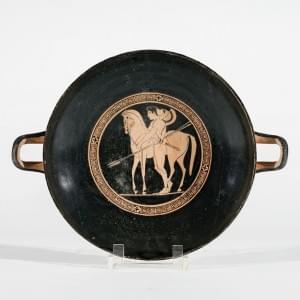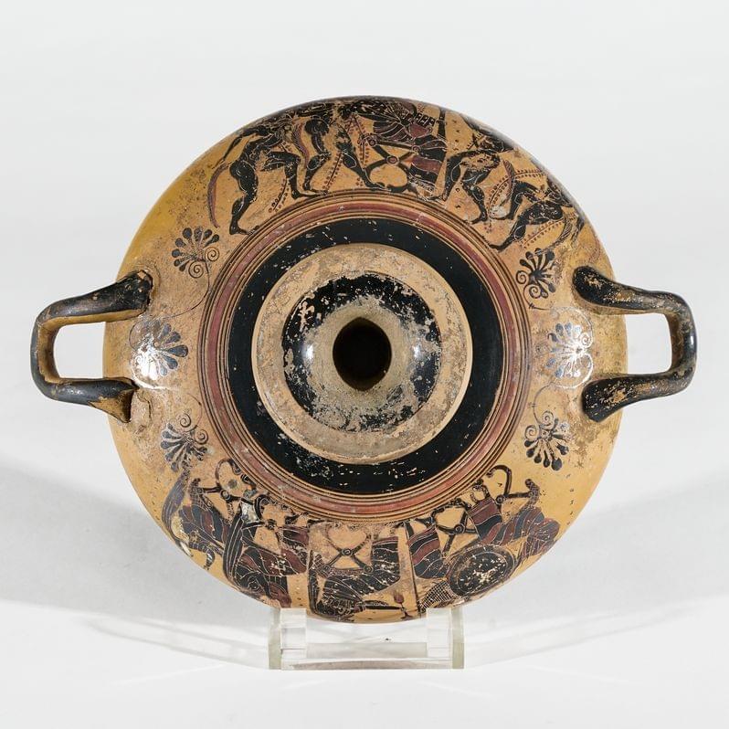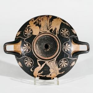 Ornés au centre l'un d'un satyre, l'autre d'un cavalier et sa monture, au dos l'un à décor de divinités, l'autre d'une procession dyonisiaque, terre cuite, H 11 cm, D 27 cm