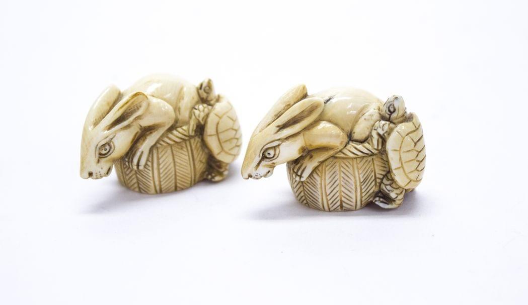 3557. Deux netsukes figurant un lapin et une tortue, Japon, début XXe s