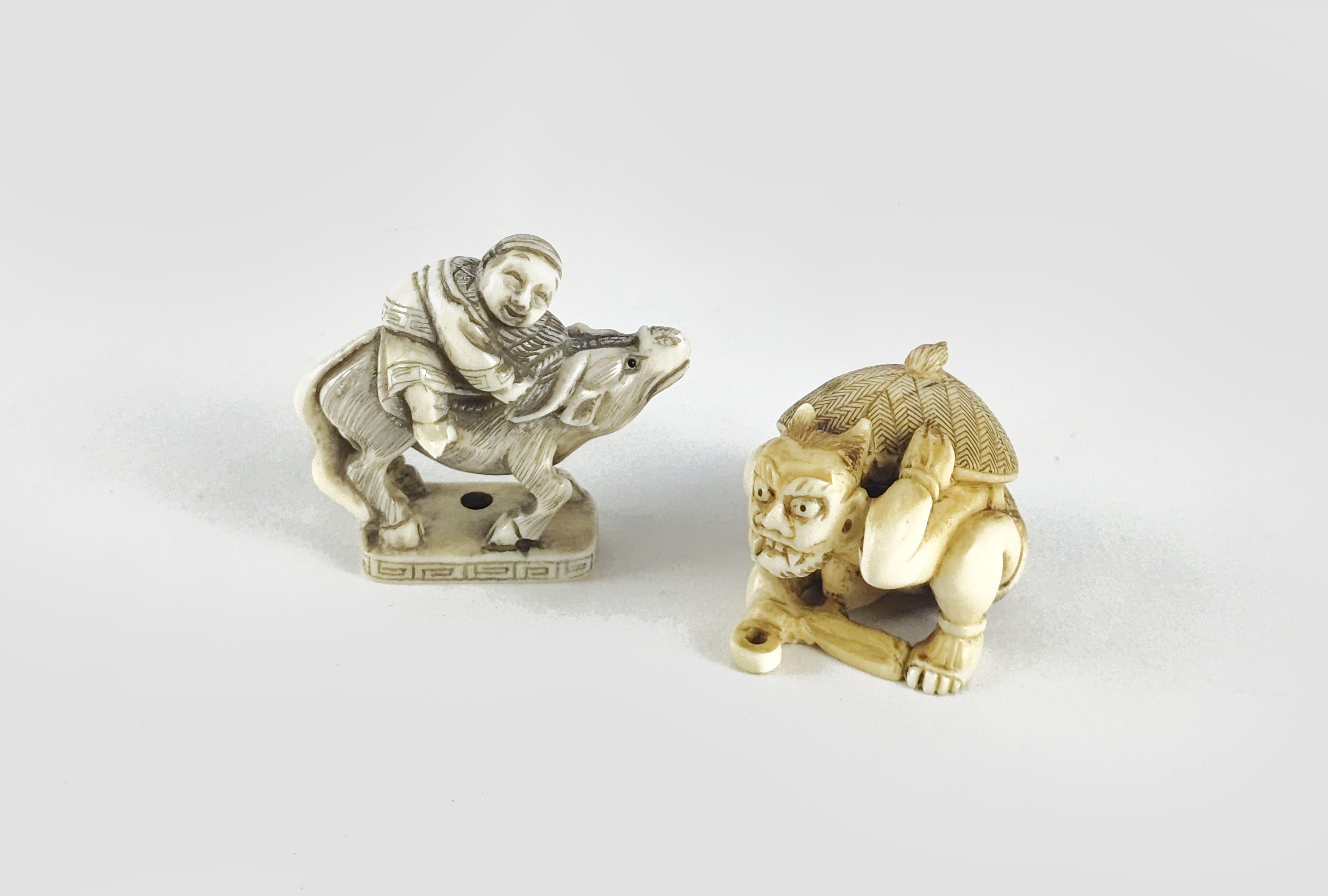 5365. Deux netsukes figurant un monstre au bouclier et un cavalier, Japon, époque Meiji (1868-1912)