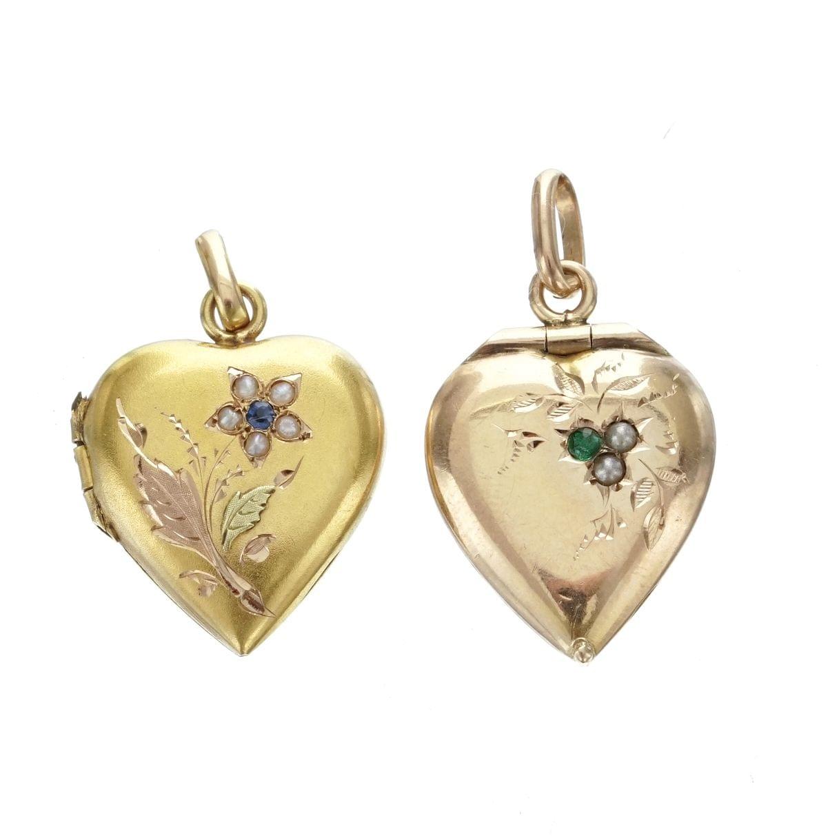 3189. Deux pendentifs porte-photos en forme de coeur sertis l'un de saphirs et de demi-perles et l'autre d'émeraudes et demi-perles