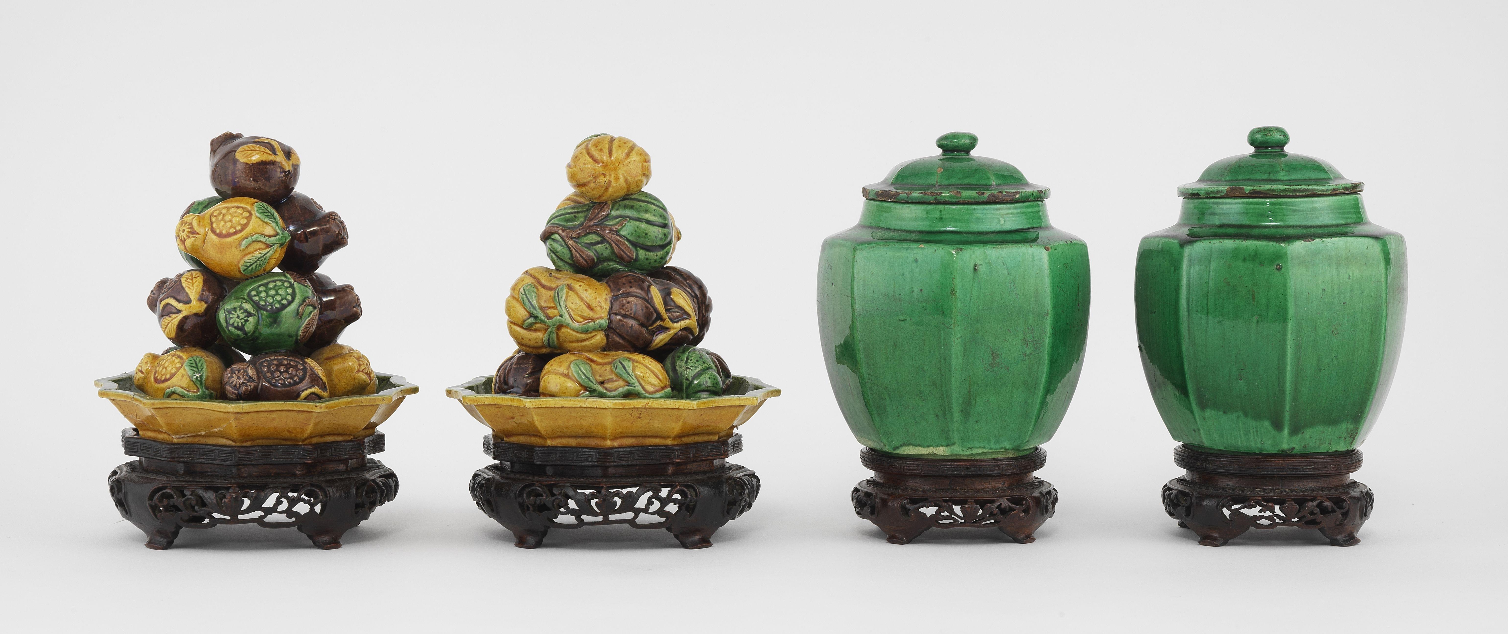 4918. Deux petites jarres couvertes et pyramides de fruits en trompe-l'oeil, Chine