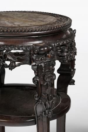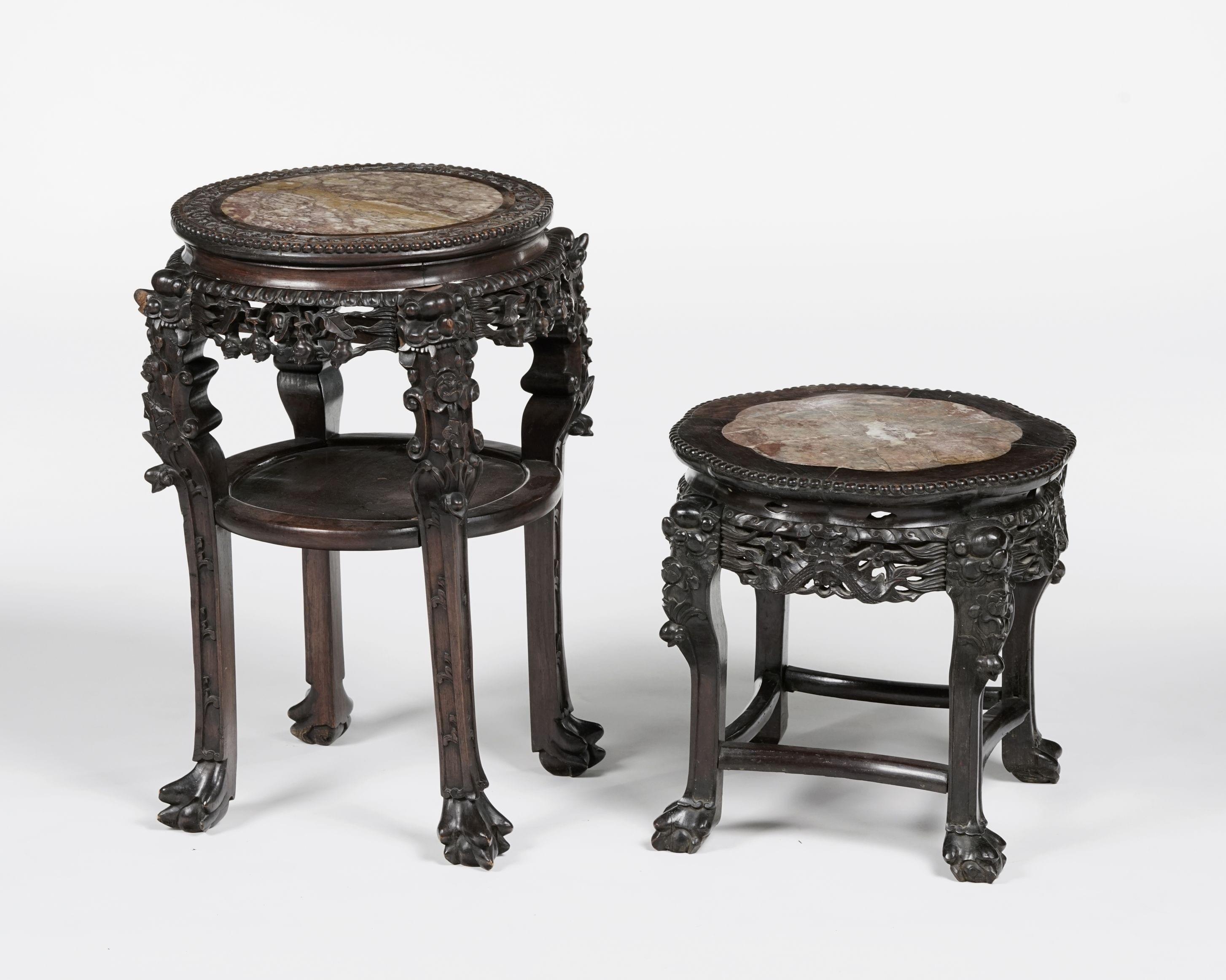 Bois sculpté, dessus de marbre, H 46 et 70 cm