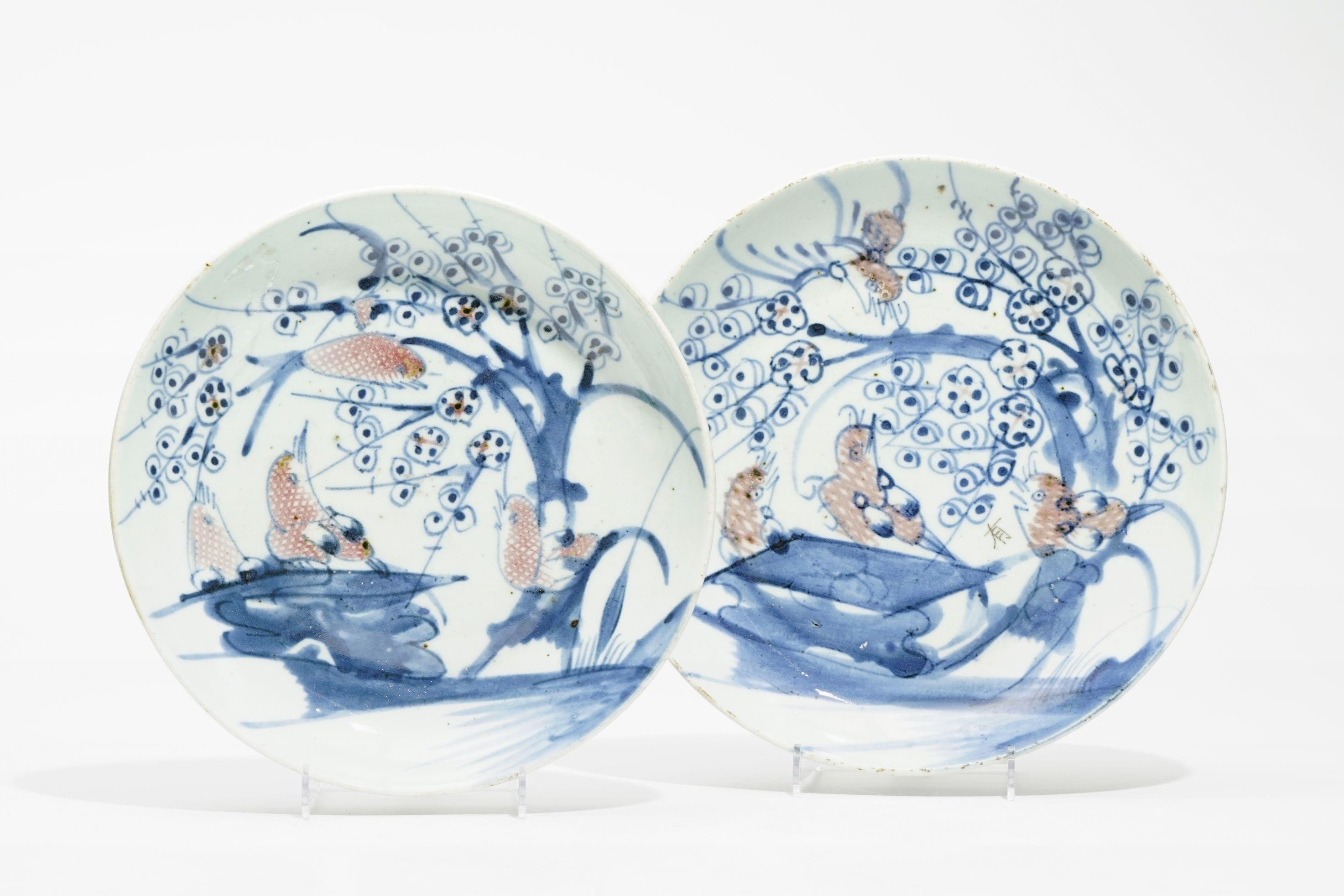 Porcelaine émaillée bleu et rouge à décor d'oiseaux branchés, D 23 et 25 cm