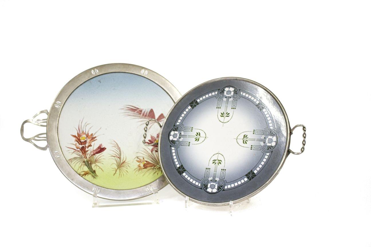 Céramique à décor polychrome de fleurs et motifs stylisés et métal, D 34 et 30 cm