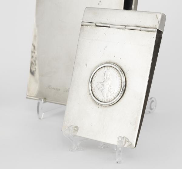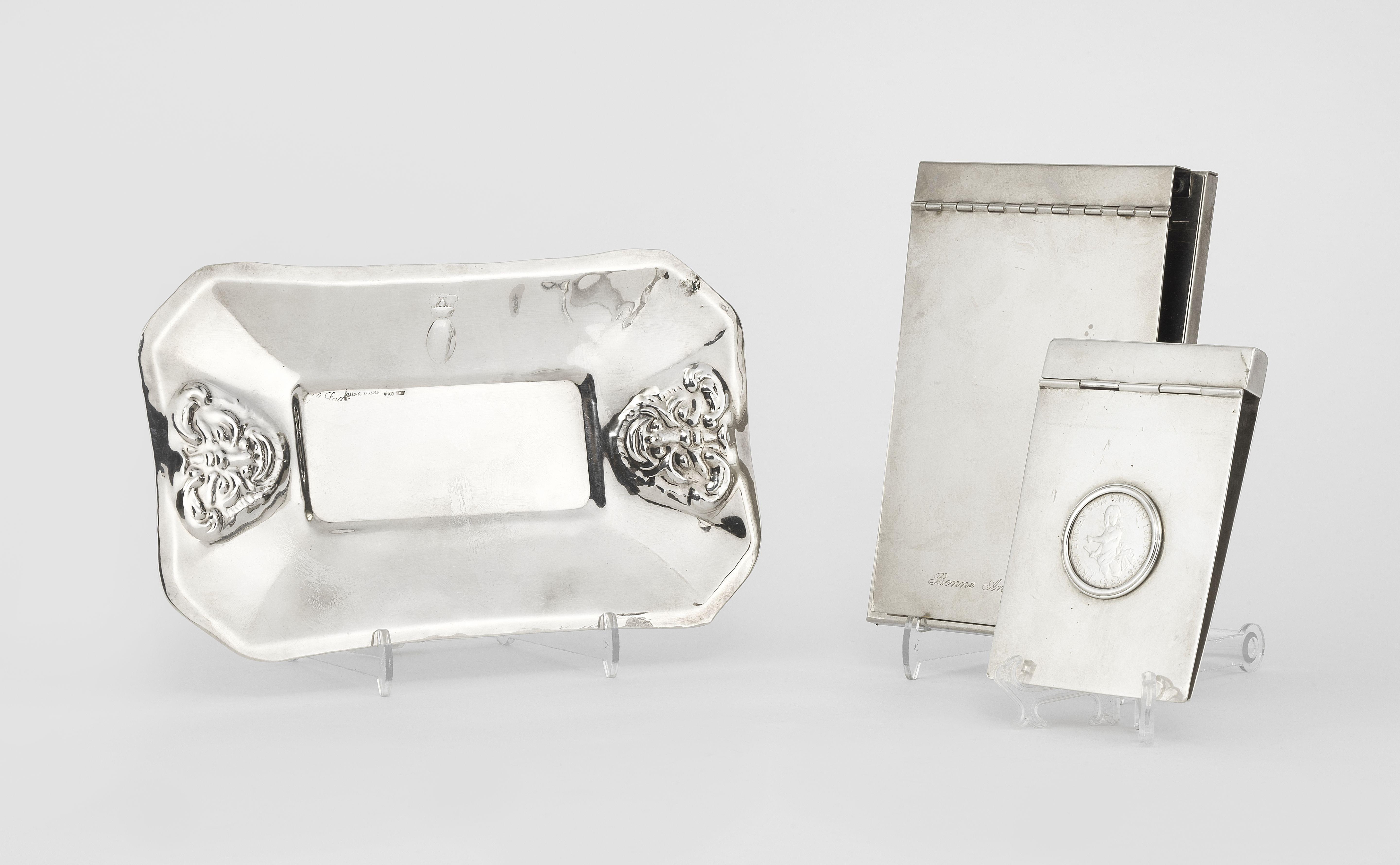 Métal argenté et argent pour le vide-poche, 160 g, L de 11 à 21 cm. Provenance: Collection Prince et Princesse de Savoie. Provenienza: Collezione Principe e Principessa di Savoia