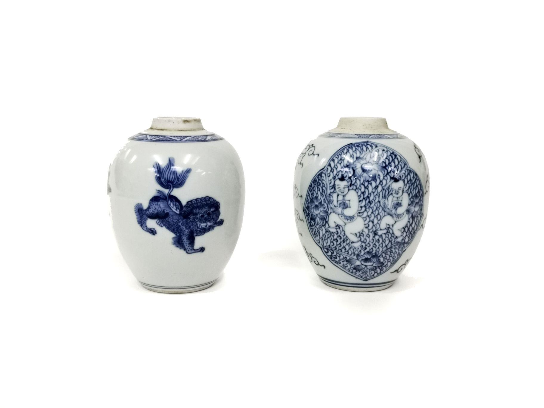 Porcelaine émaillée bleu blanc à décor de chiens de Fô et personnages, H 14 cm