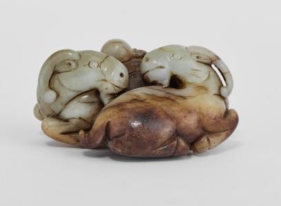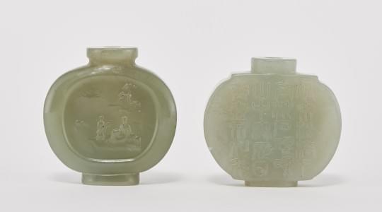 Jade à motifs de personnages et calligraphie, H 5 et 5,5 cm