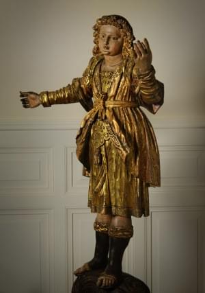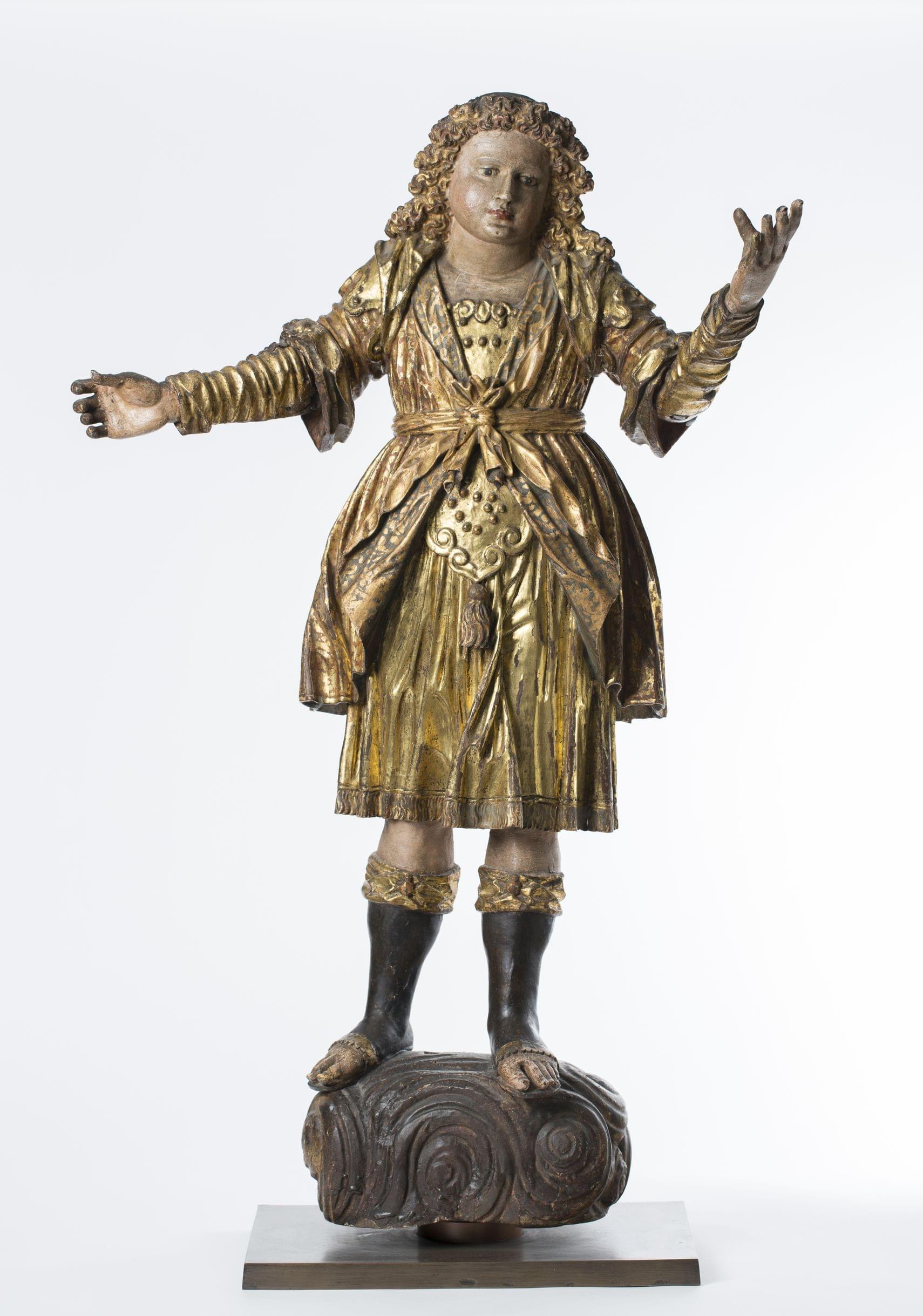 Figurés debout richement parés et reposant sur des nuées, bois doré et polychrome, H 106 cm, socle moderne en marbre noir. Collection David Sassoon