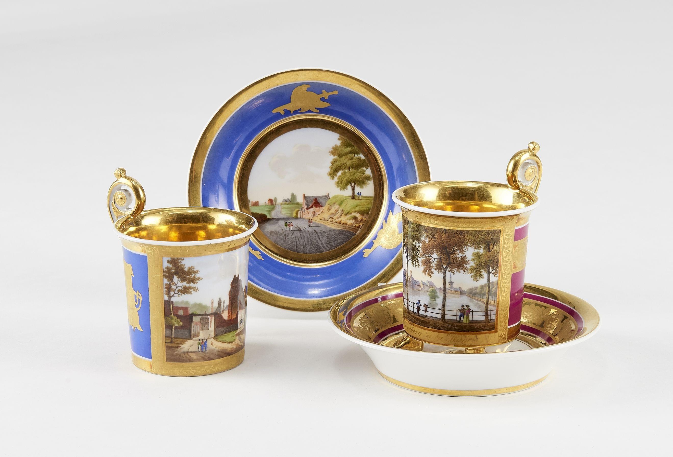 336. Deux tasses néoclassiques l'une à décor pourpre et or mat et brillant, ornée en réserves d'une vue du Korte Vijverberg à La Haye, l'autre à décor de trophées ors sur fond bleu, ornée de paysages romantiques en réserve