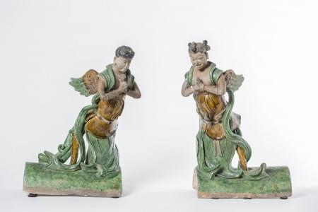Figurant deux personnages ailés, céramique vernissée polychrome, H 43 cm. Collection David Sassoon