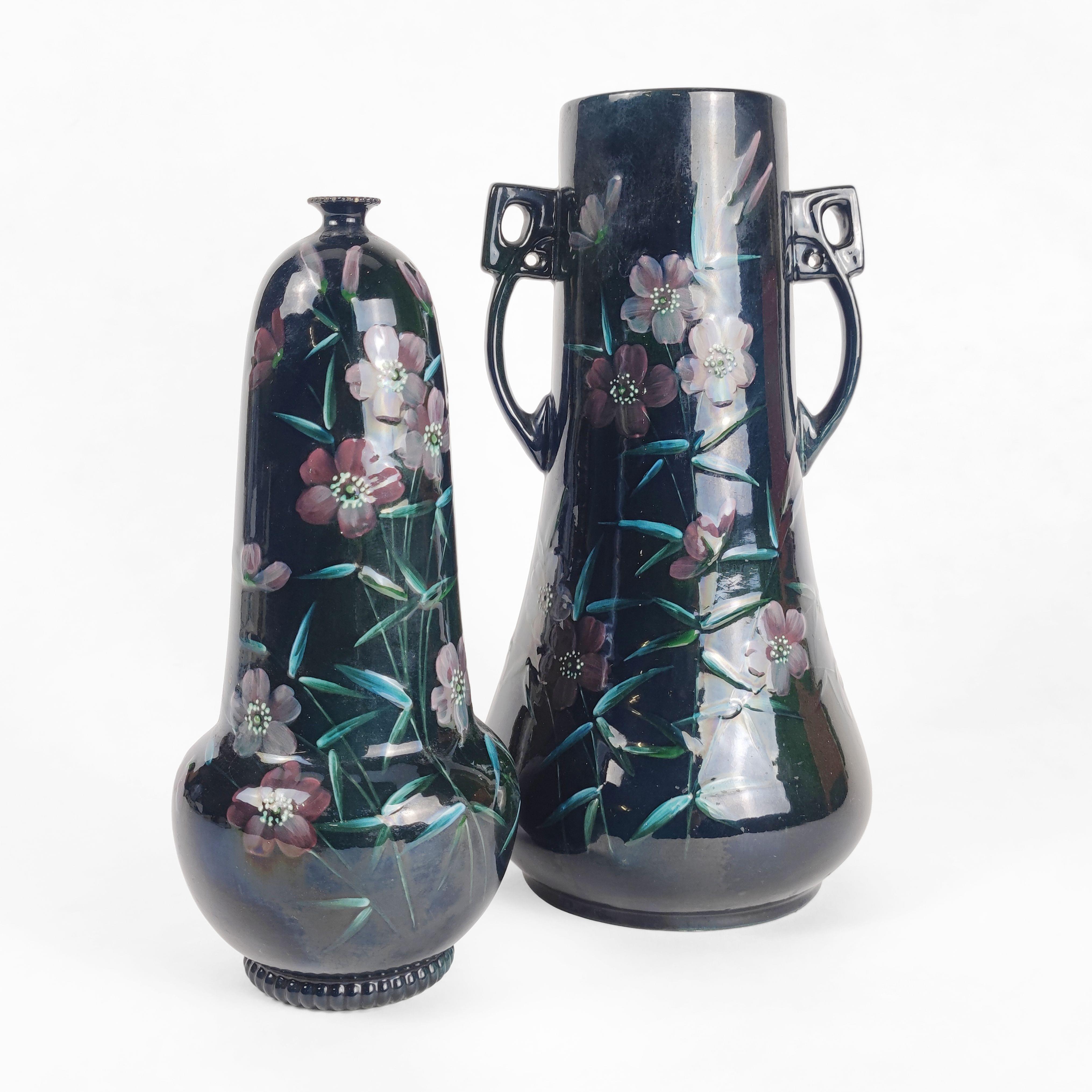 Céramique à décor émaillé de fleurs sur fond noir, H 29 et 32 cm
