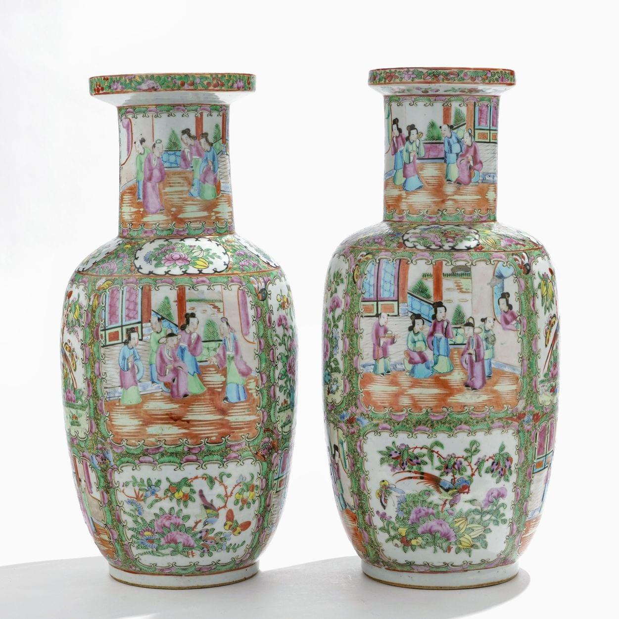 Porcelaine émaillée polychrome à décor de scènes animées, d'oiseaux et fleurs en réserve, H 44 cm
