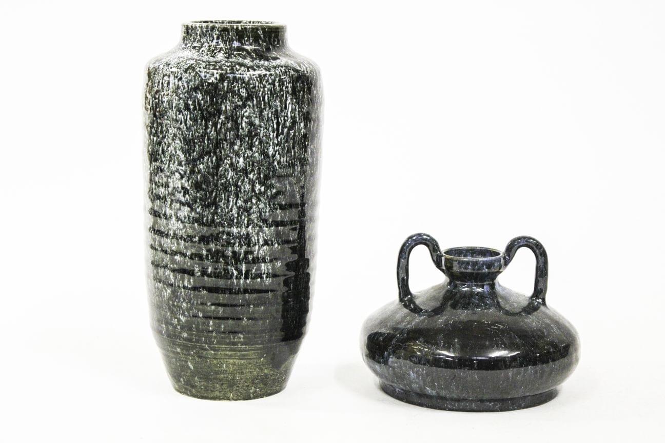 Céramique à glaçure mouchetée, l'un sur fond vert, l'autre sur fond bleu, H 25 et 10 cm