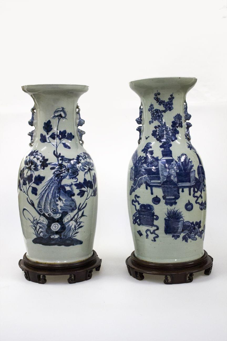 Porcelaine émaillée bleu et céladon à décor de vases fleuris, H 44 cm (percés)