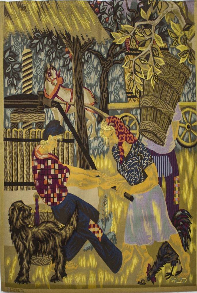 Scène de vendanges, tapisserie d'Aubusson, laine, éditée par l'atelier Pinton Frères, signée, 180x154 cm