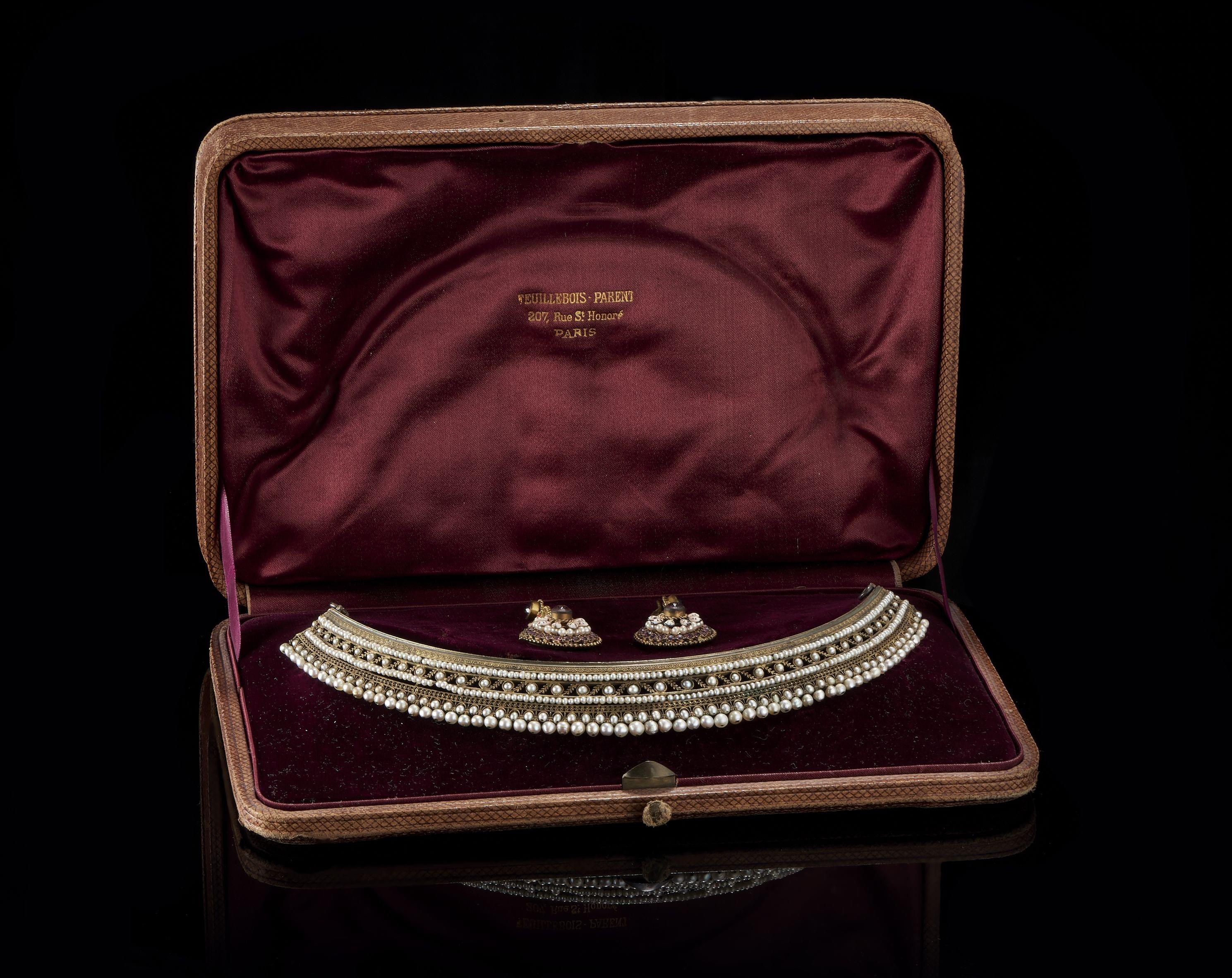 Travail XIXe s, laiton doré, H, 11 cm, dans son écrin Feuillebois-Parent, 207, rue Saint-Honoré, Paris. On joint une paire de clips d'oreilles sertis de verres d'imitation pour l'améthyste et de perles émaillées peintes, laiton doré, H 4,5 cm.