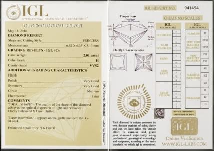 784. Diamant sur papier taille princesse, 2,01 ct, H, VVS2 selon son certificat IGL