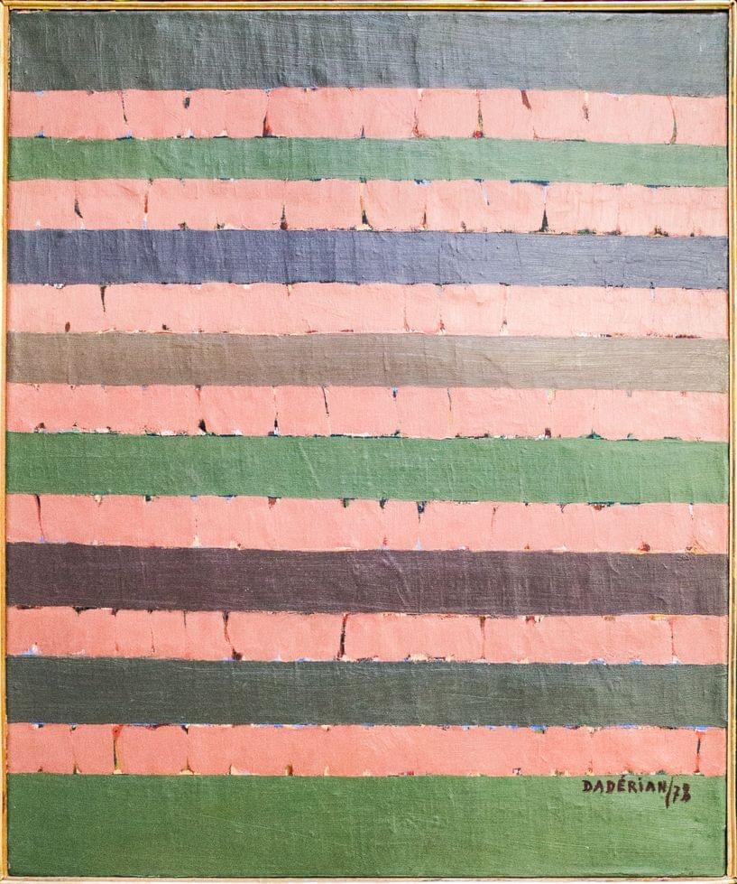 Abstraction en vert et rose, huile sur toile signée et datée 73, 65 x 52 cm
