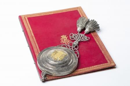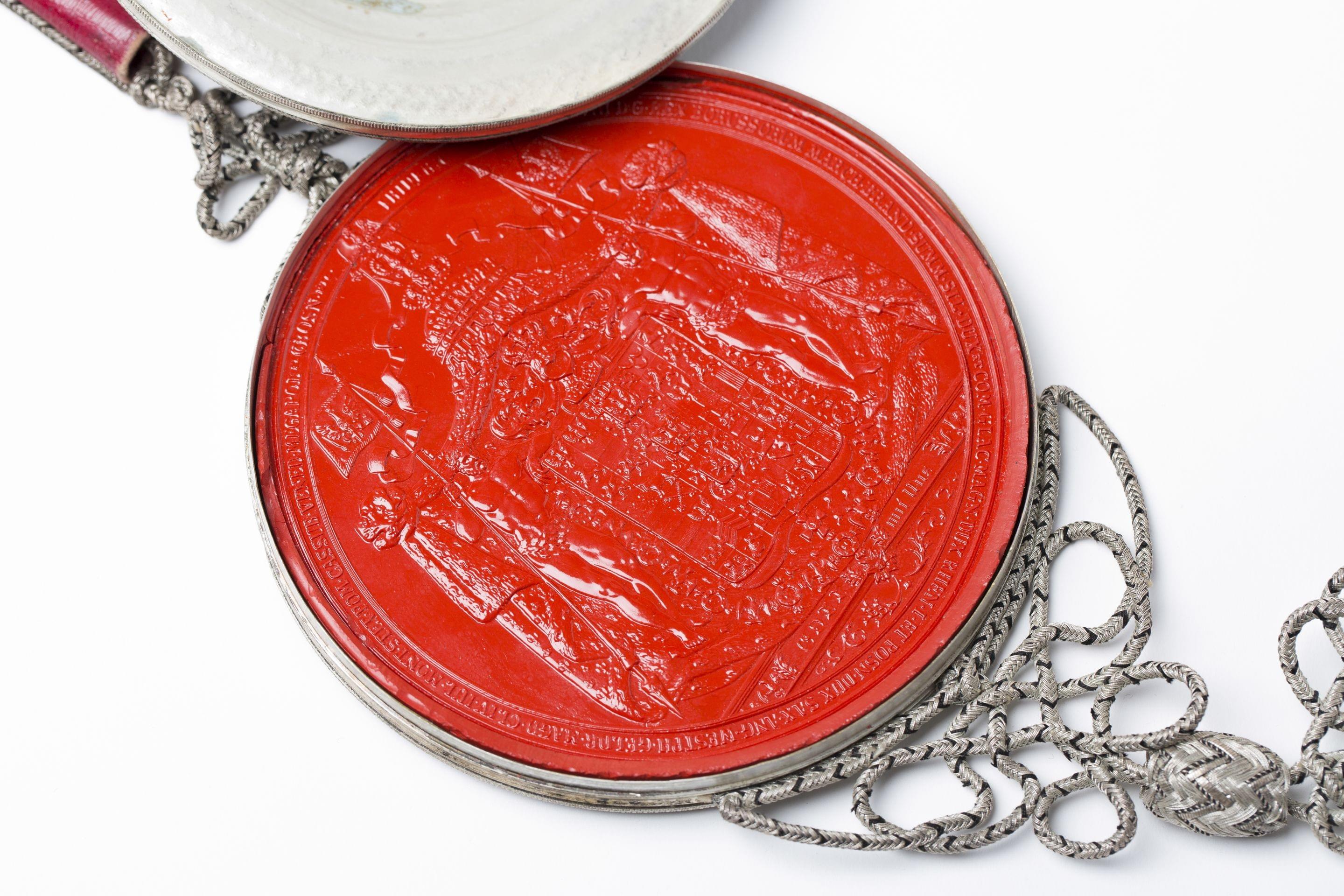 Reliure en cuir rouge doré au petit fer, encre sur parchemin, texte en allemand gothique contresigné en français par le Conseiller d'Etat Auguste de Montmollin à Neuchâtel le 1er avril 1828, grand sceau en cire rouge dans son emboîtement en métal argenté aux armes de Prusse, H 38 cm, 14,5 cm