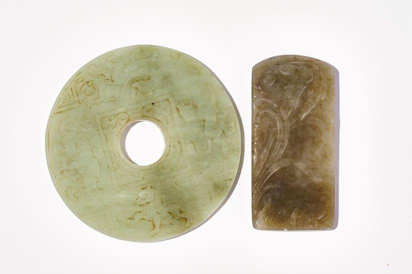 Jade gravé de félins et oiseaux, L 7,6 cm et 7 cm