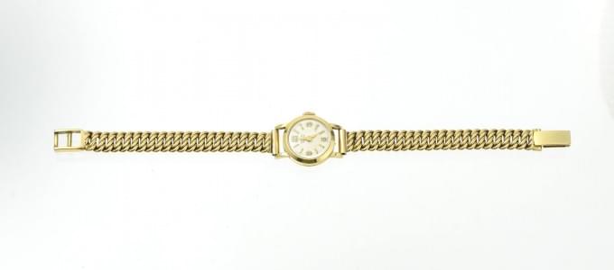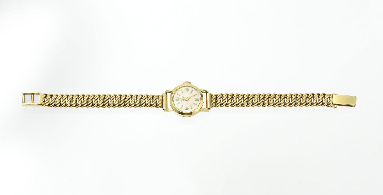 Cadran blanc, chiffres arabes, index bâton et aiguilles dorés, or 750, D 14 mm, poids brut 23 g. Ce lot est vendu au profit de la Fondation des Grangettes, recherche contre le cancer.