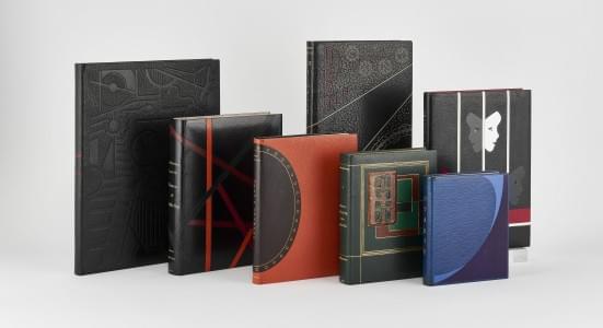 In 8°, mar. vert à décor mos., plat sup. orné d'un émail, contreplats doublés de chagrin havane, coffret. Reliure de Roselyne BARNAUD, ill. de BRUNELLESCHI et ornementation de MAURICE L'HOIR.
