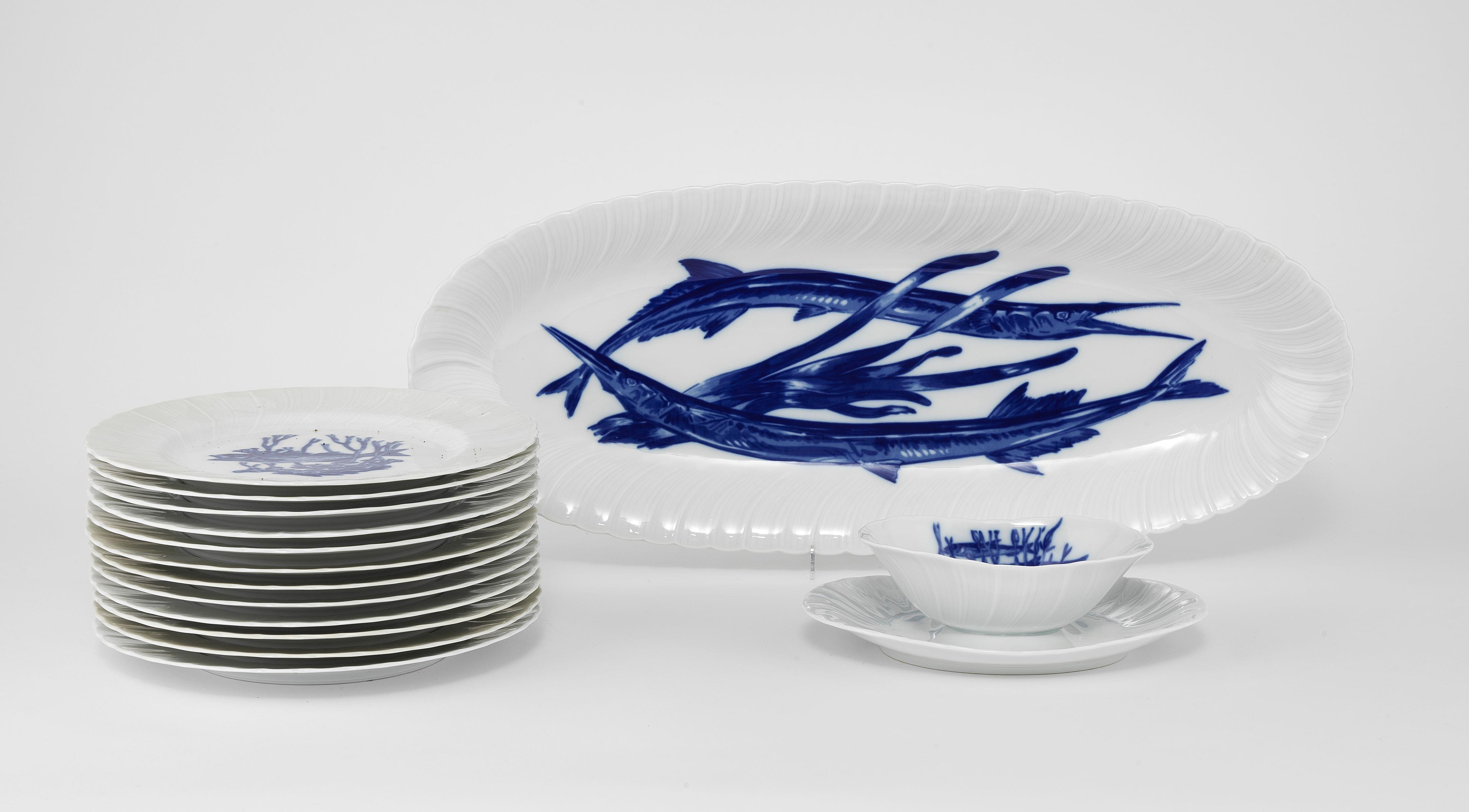 3882. Douze assiettes, un plat et une saucière à décor de poissons