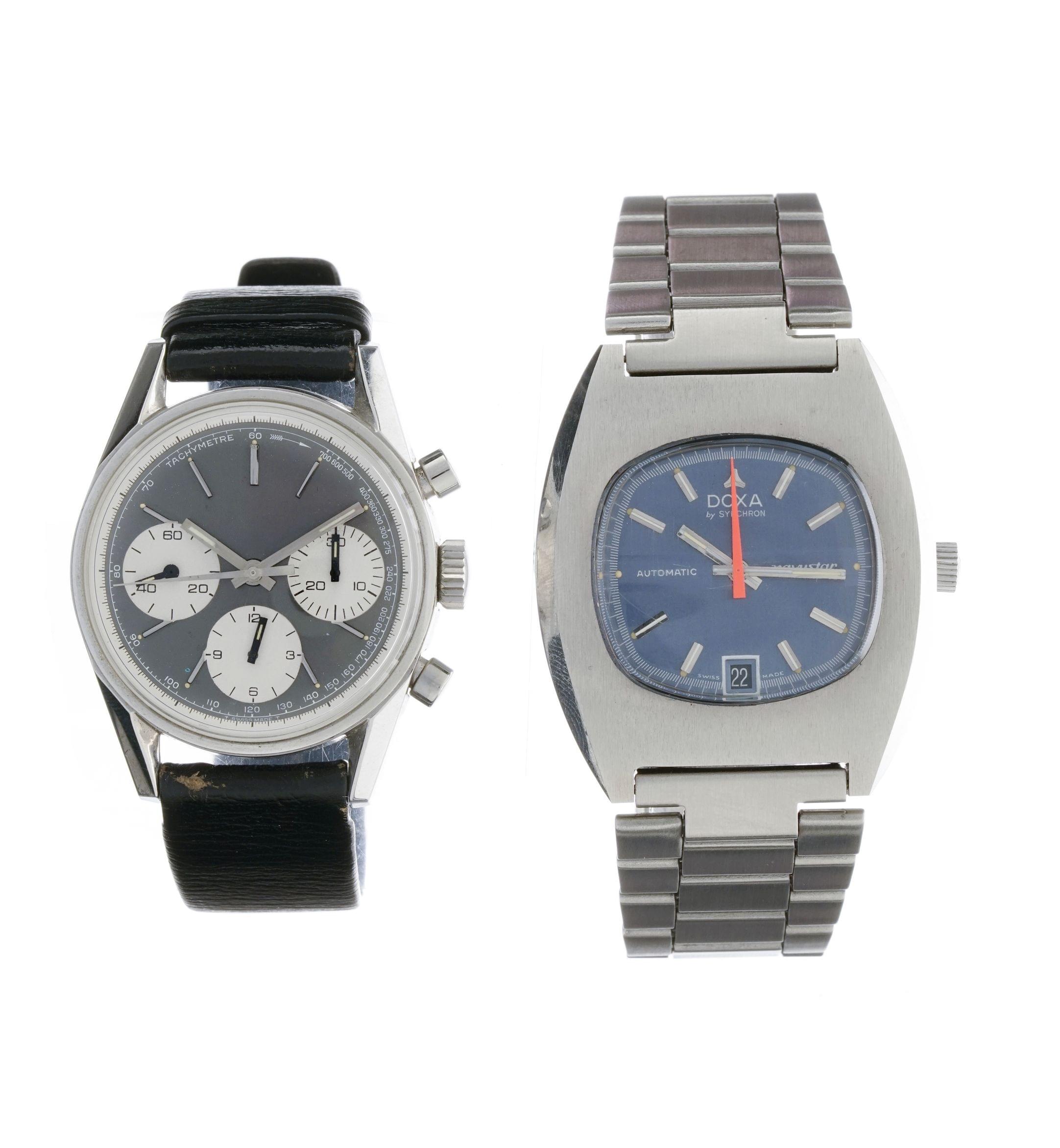 Cadran bleu, aiguilles et index bâton luminescents, trotteuse rouge, date à guichet à 6h, acier, 37x37 mm, . On joint une montre chronomètre mécanique avec cadran gris, aiguilles luminescentes argentés, trois petits cadrans, acier, D 34 mm.