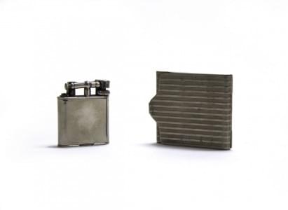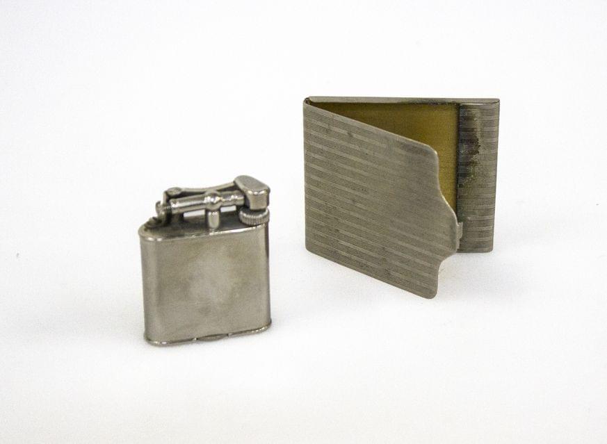 3225. Boîte à craie de billard, deux étuis à allumettes et un briquet,...