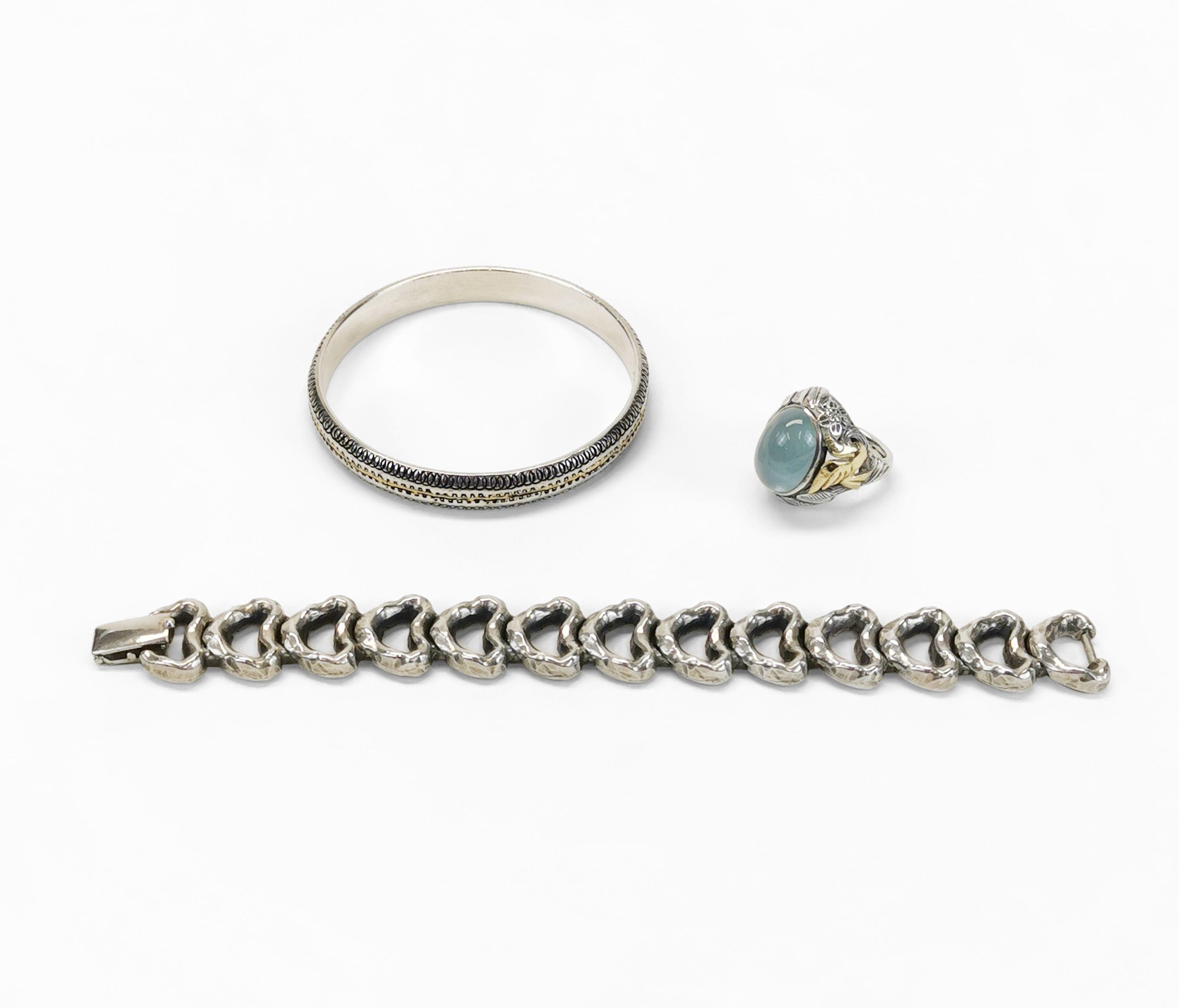 Une bague sertie probablement d'une topaze bleue taille cabochon, un bracelet souple à maille stylisée et un bracelet jonc centré d'un ligne dorée, argent 925, doigt 56-16, L 17,5 cm, D int. env. 6 cm