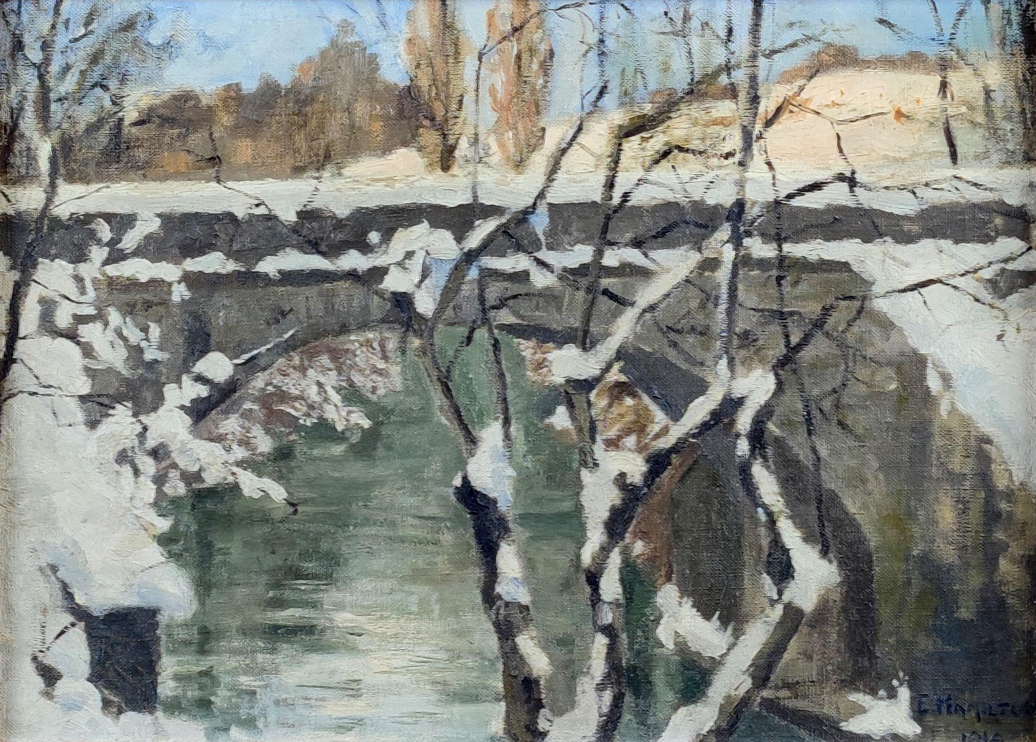 Jeune fille à la robe bleue laçant sa chaussure, huile sur toile...