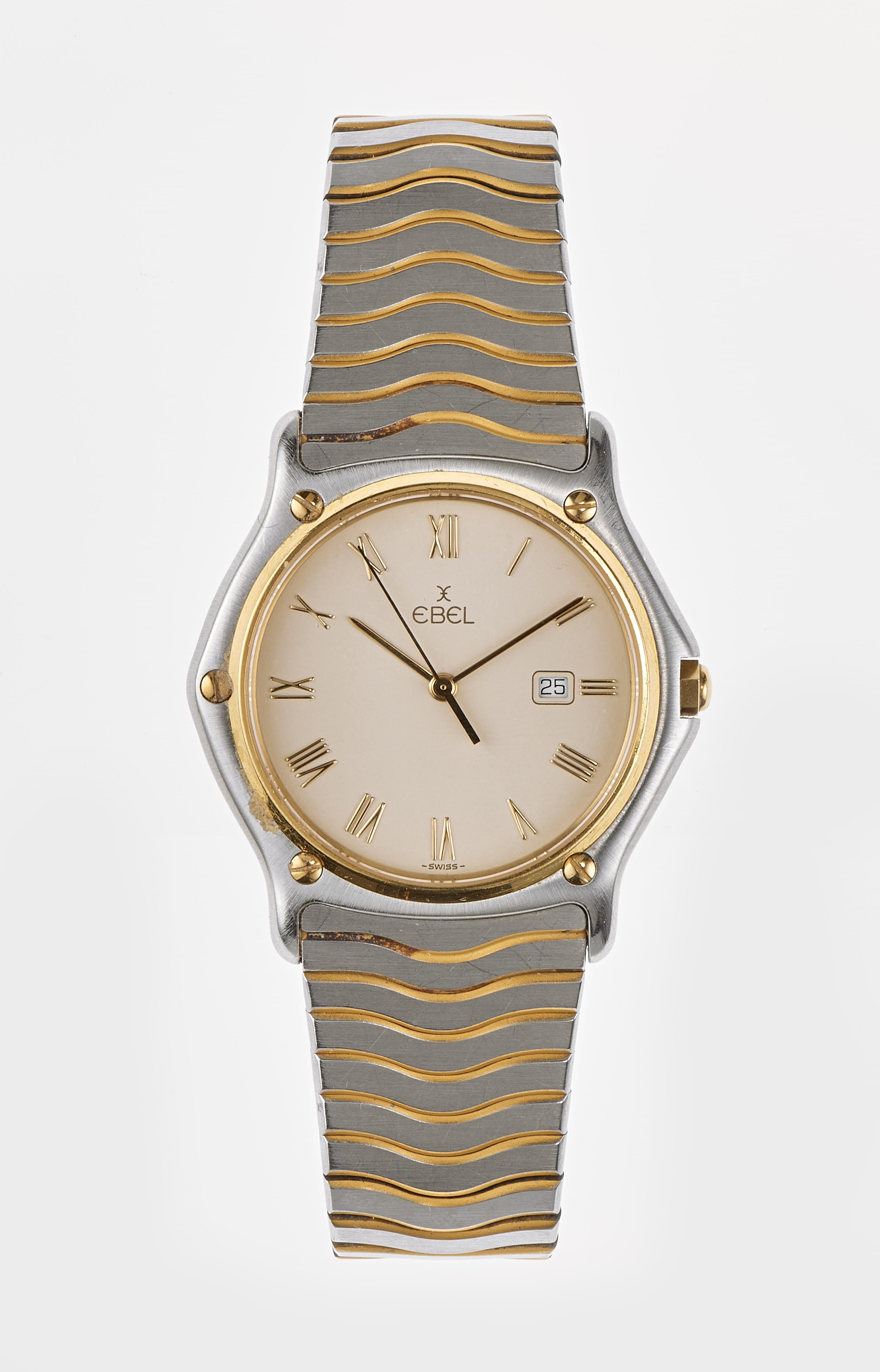 Cadran crème, aiguilles et chiffres romains noirs, date à guichet à 3h, acier, D 34 mm