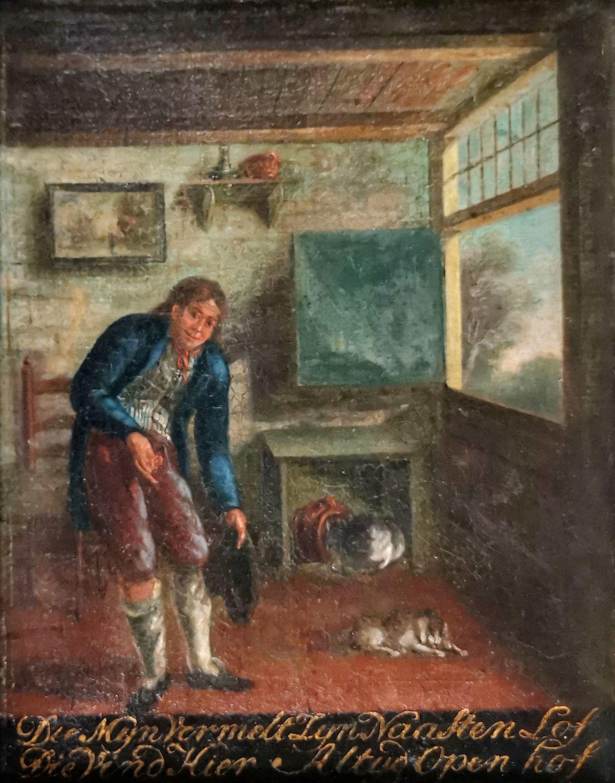 Deux illustrations de proverbes, paire d'huiles sur toile, 32x25 cm