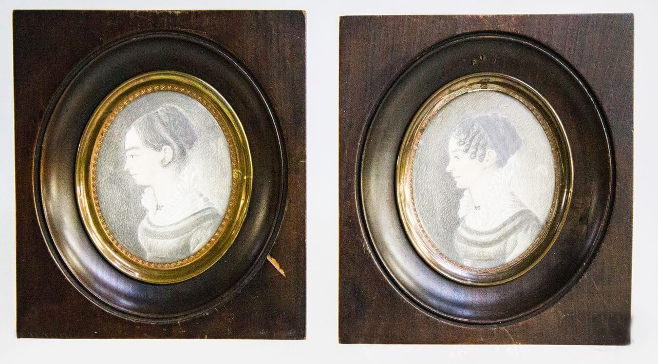Rosette Frank-Küpper et sa soeur, paire de miniature, mine de plomb sur papier, 7 x 5,5 cm
