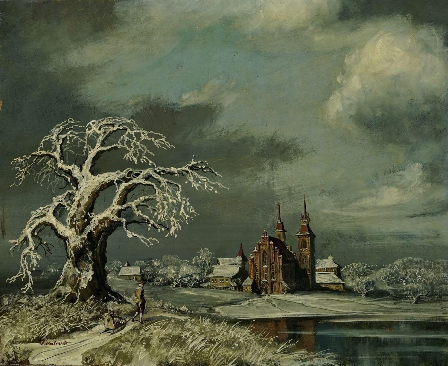 Paysage enneigé, huile sur toile, signature non identifiée, 59x72 cm