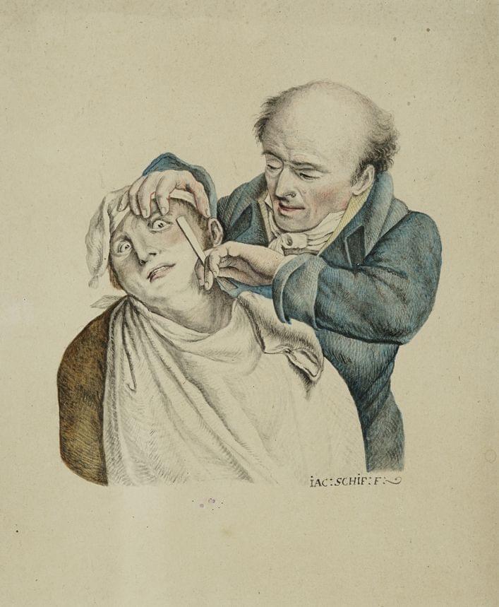 Le barbier, aquarelle sur papier, signée Iac Schif, 21x25 cm