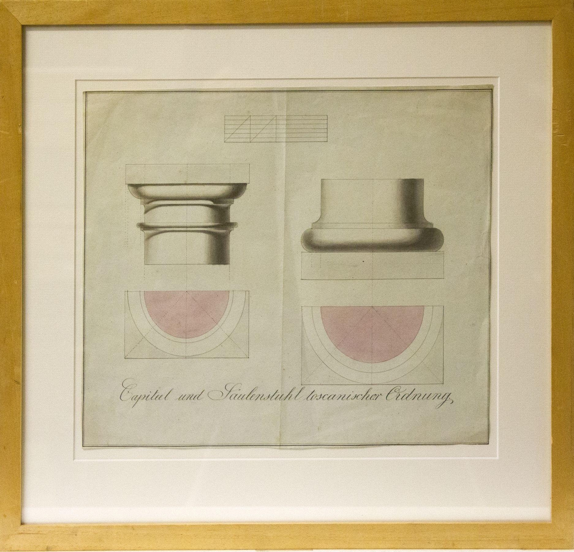 Etude d'une colonne toscane, dessin d'architecte, lavis sur papier, 27x35 cm