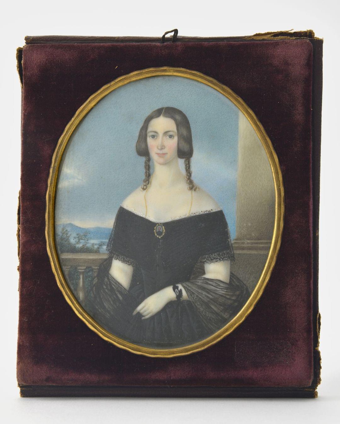 Jeune femme en robe noire, miniature, aquarelle et gouache sur ivoire, H 11 cm