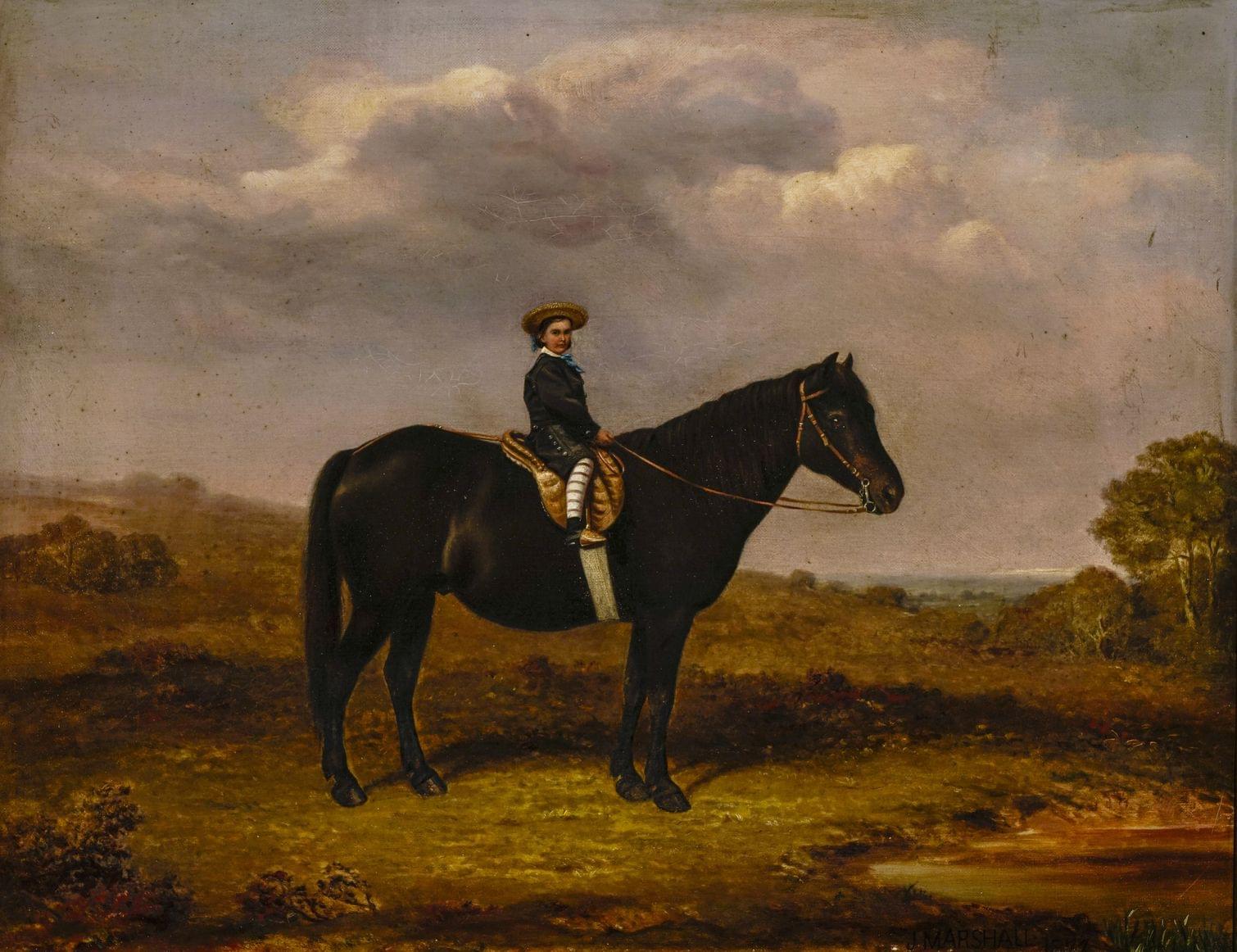 Enfant sur un poney, huile sur toile, signée et datée 1877, 42x56 cm