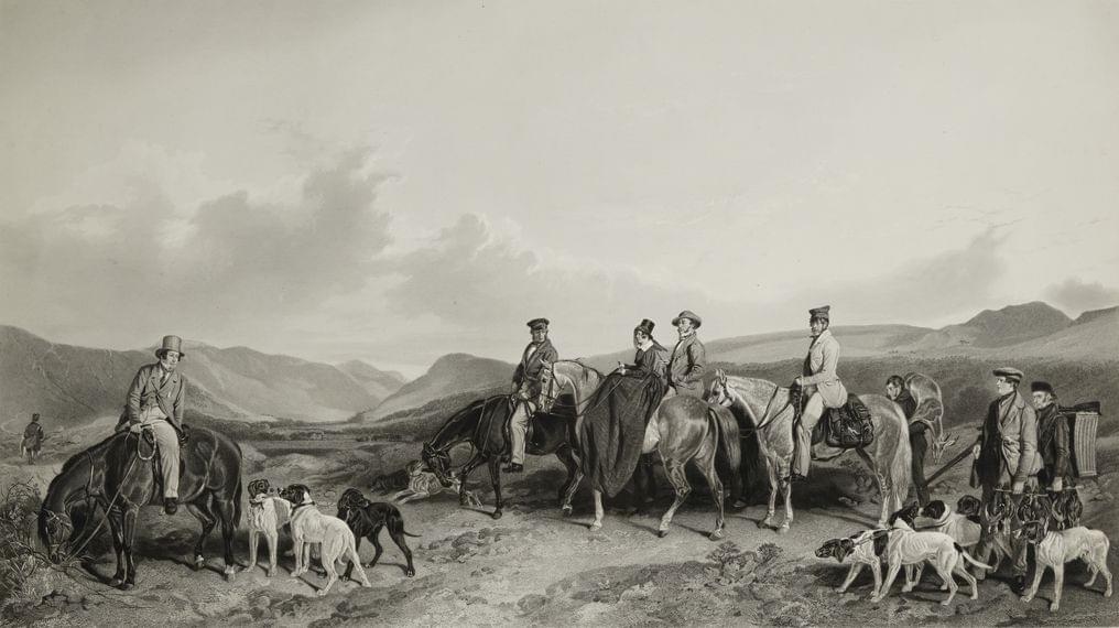 Scène de chasse, lithographie, 50x87 cm