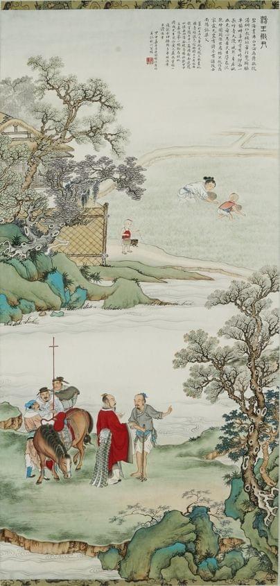Personnage mythique et poésie, peinture sur papier de riz montée...