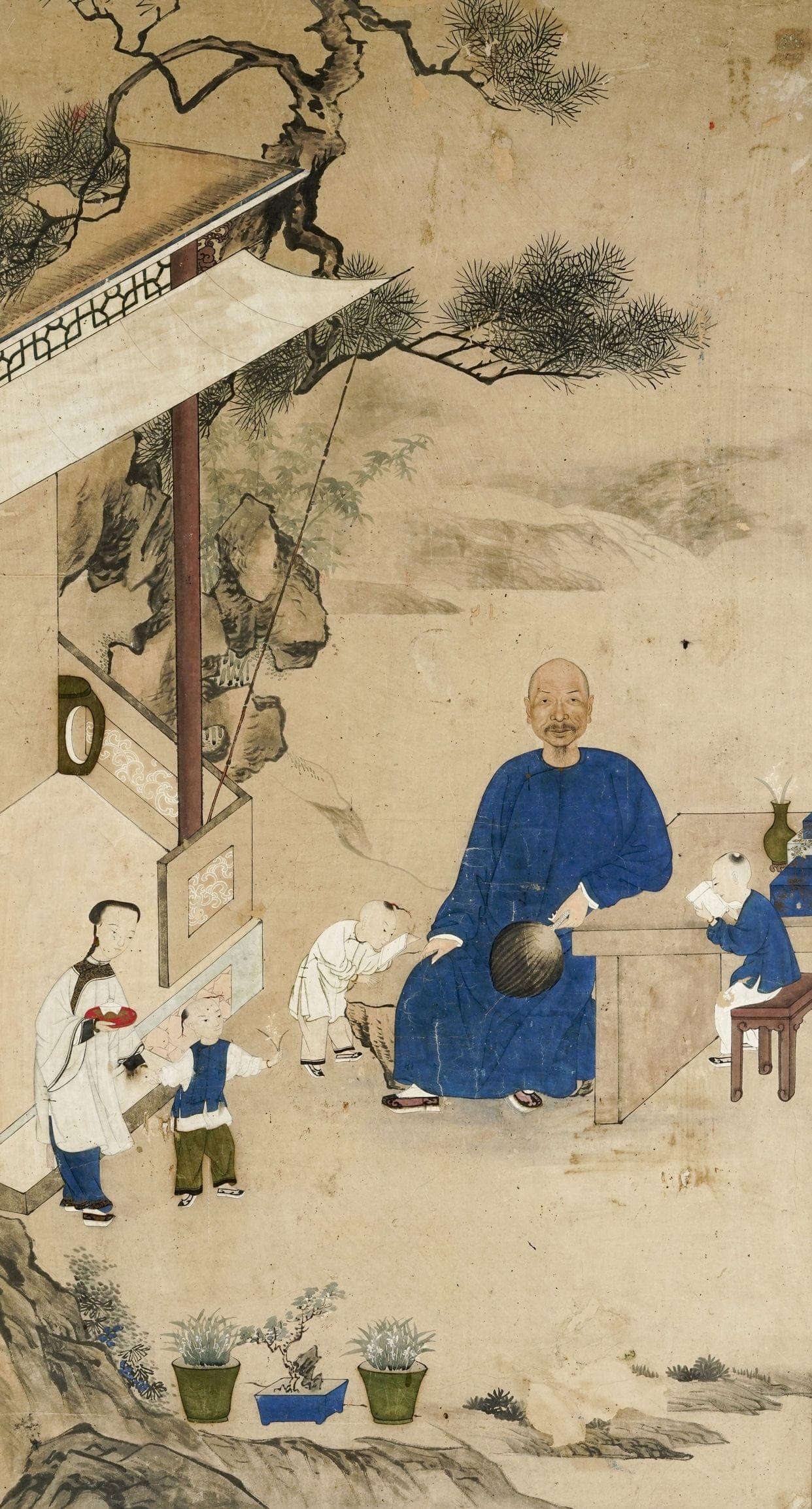 Scène de genre avec père, enfants et concubine, gouache et encre sur papier, 129x70 cm