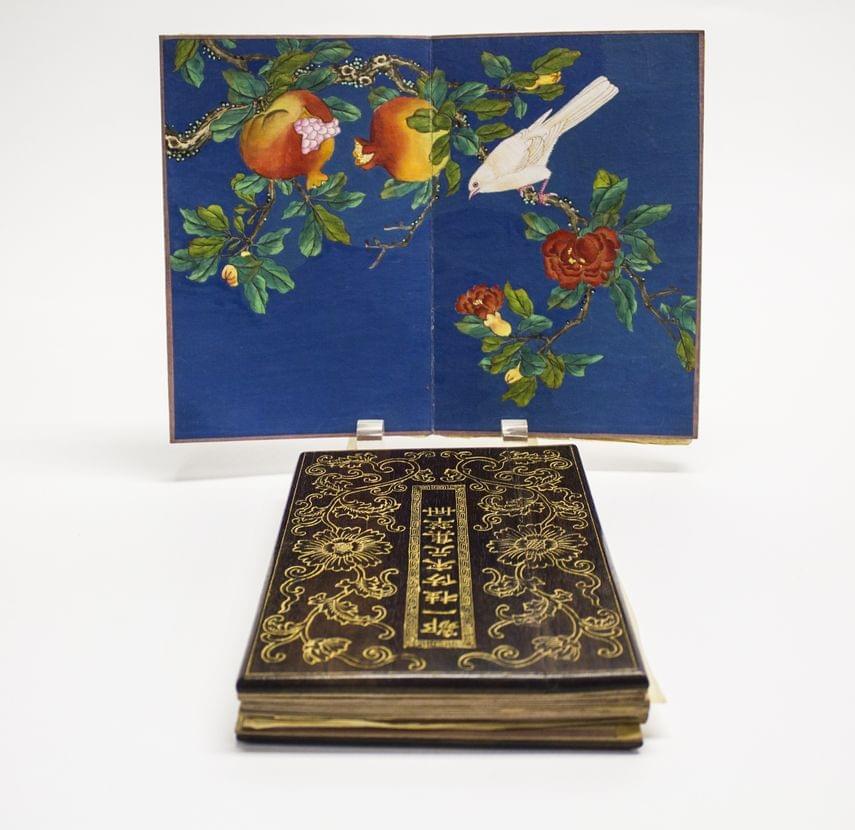 Paire de livrets contenant des peintures de fleurs et végétaux, reliures en bois gravé, signés, 20x14 cm