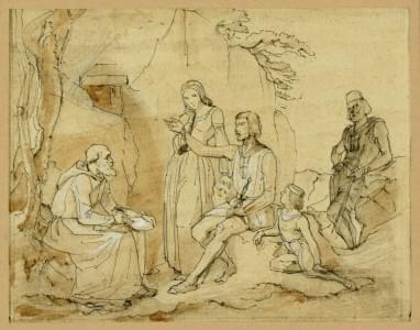 Réunion de personnages près d'une grotte, encre et lavis sur pap...