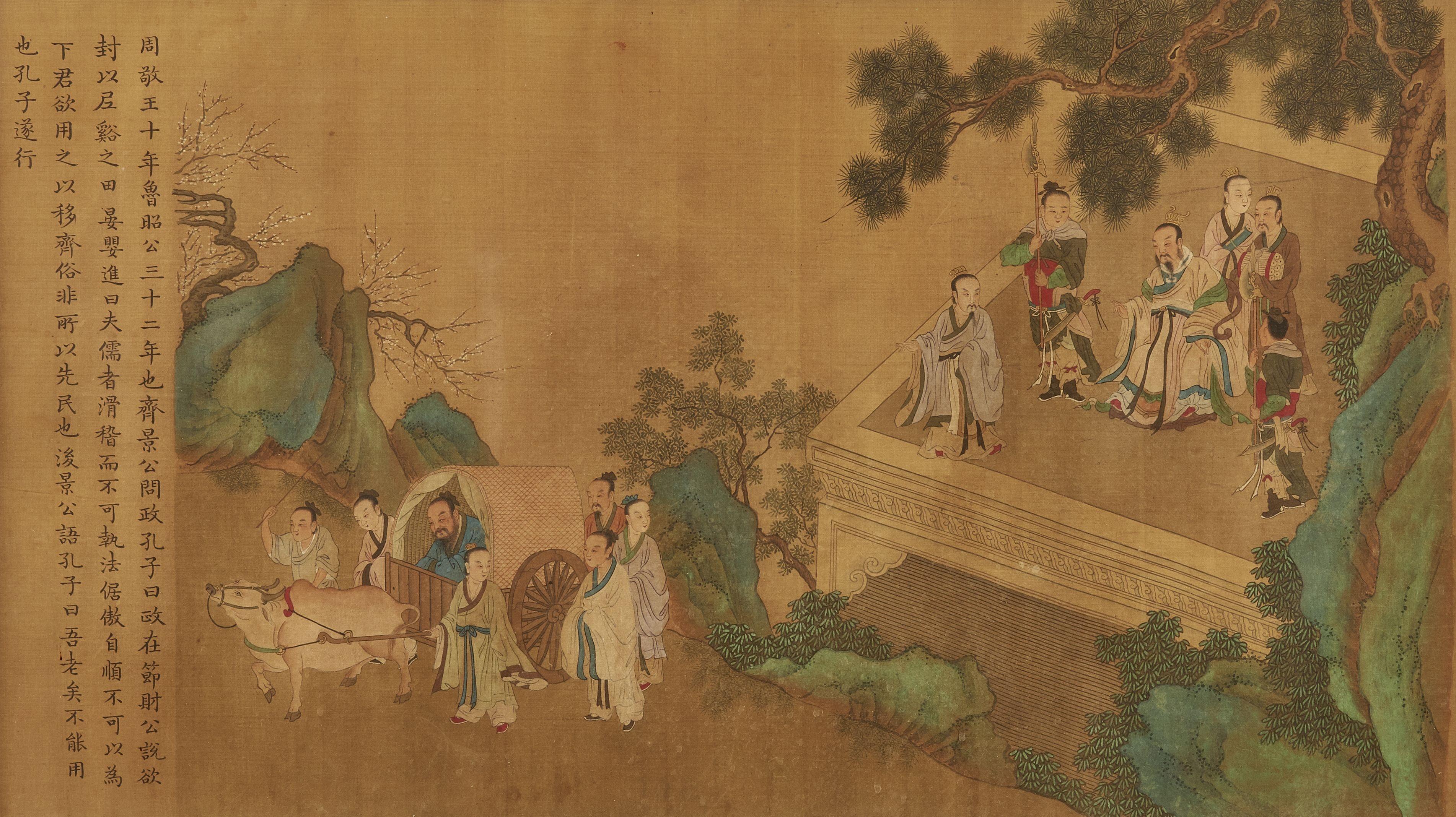 Scène de cour avec dignitaire, encre et gouache sur soie, 40x70 cm
